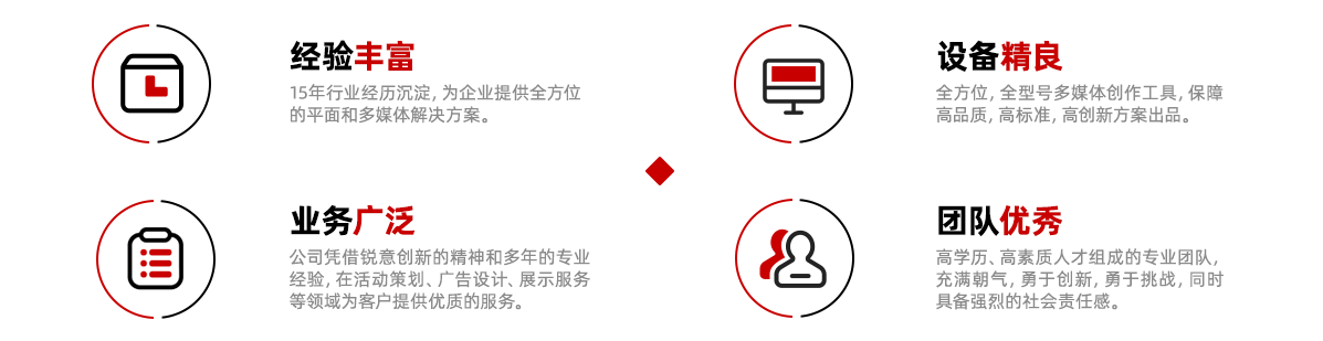 憑借銳意創新的精神和多年的專業經驗,在活動策劃、廣告設計、展示服務等領域為客戶提供優質的服務。